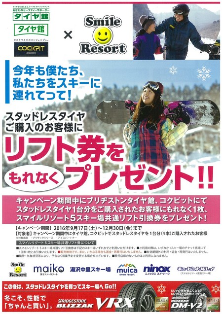 スタッドレスタイヤ購入のお客様に、リフト券プレゼント中!!