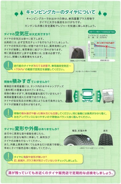 キャンピングカーはエアーチェックが大事!! ポスト 2017年1月12日 タイヤは、適正な空気圧が入っていて、 その車両の重さを支える事ができます。 特に、キャンピングカーは、お出かけの際、 荷物を多く積む事がありますので、お出かけ前の 空気圧チェックが大事です。 さらに、時期がかなり経過したタイヤは、 溝があっても、交換をオススメします。 タイヤ館は、いつでも無料タイヤ点検を実施していますので、 お気軽におこし下さい。 担当:齋藤