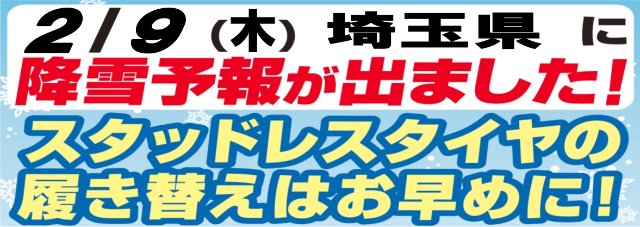 2/8(木)に降雪予報!! ポスト 2017年2月6日 2/8(木)に、埼玉県に降雪予報が出ています。お車にスタッドレスタイヤの装着は大丈夫ですか?もし未装着でしたら、早めの装着オススメです! http://weather.yahoo.co.jp/weather/jp/11/4310.html 担当:齋藤