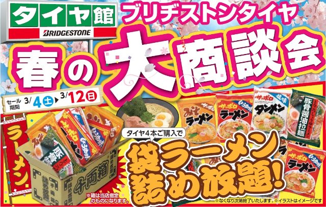 期間中タイヤ4本ご購入で『袋ラーメン詰め放題』を開催致します。