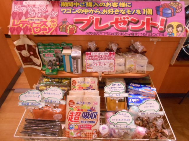 明日3月1日よりレディースウィーク!! ポスト 2018年2月28日 毎月1日~7日まで、 「レディースウィーク」を開催しております。 ご来店の女性のお客様に、 商品をご購入していただいた際には、 もれなく、プレゼントを差し上げております。 かごの中から、1品お好きな物を選べますので、 ご来店お待ちしております。 担当:久保