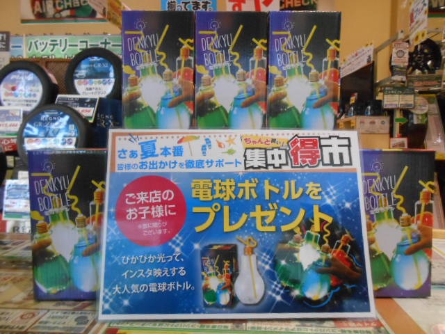 只今、夏フェス・集中得市開催中!! ポスト 2018年7月22日 こんにちは!!タイヤ館 所沢です。 暑い日が続いてますね。 夏休みのお出かけのご予定はお決まりですか? 只今、夏フェス&集中得市を同時開催中です!! お出かけのご準備をぜひ、タイヤ館でいかがですか? 7月29日(日)までセールとなっております! 期間中、ご来店のお子様に ピカピカ光ってインスタ映えする電球ボトルをプレゼント♪♪ お得なこの機会にご来店お待ちしております!!