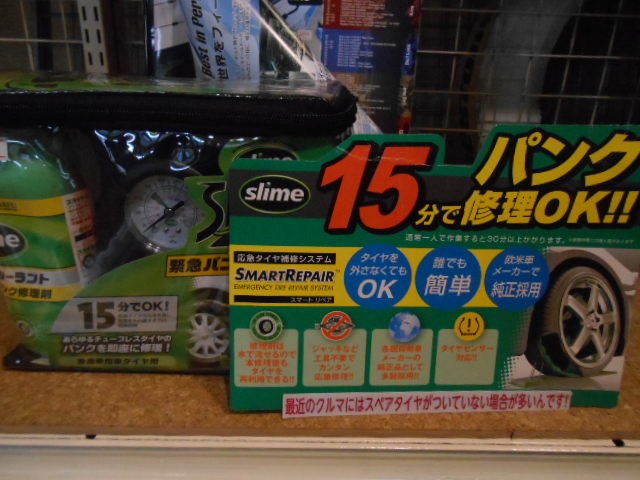 パンク修理剤!! ポスト 2018年8月24日 こんにちは、タイヤ館 所沢です。 本日のオススメ商品はスライム スマートリペア パンク修理剤のご紹介です。 内容物は修理剤とシガーソケット式エアーコンプレッサー付きです。 一度修理で修理剤を使い切っても、修理剤だけでの取り寄せもできる優れものです。 詳しい内容は当店スタッフまでお尋ね下さい!! もちろん、当店でのパンク修理も承っておりますので、お気軽にご来店下さい。 タイヤ交換なら、タイヤ館 所沢へ!! ご来店をお待ちしております。