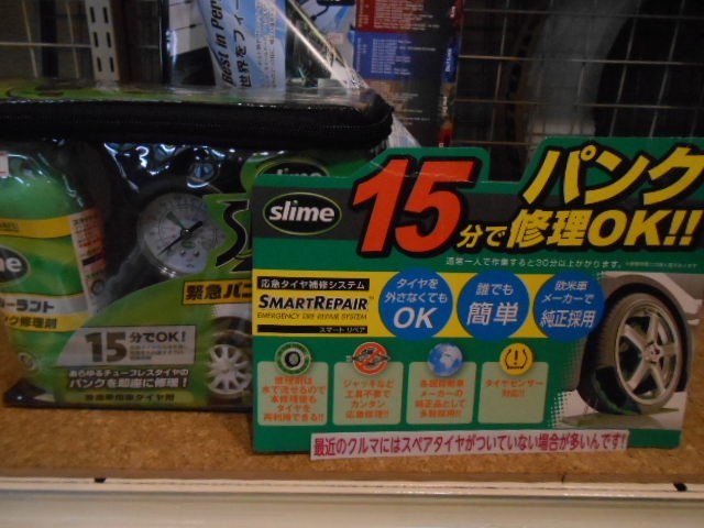 パンク修理剤!! ポスト 2018年9月22日 こんにちは、タイヤ館 所沢です。 本日のオススメ商品はスライム スマートリペア パンク修理剤のご紹介です。 内容物は修理剤とシガーソケット式エアーコンプレッサー付きです。 一度修理で修理剤を使い切っても、修理剤だけでの取り寄せもできる優れものです。 詳しい内容は当店スタッフまでお尋ね下さい!! もちろん、当店でのパンク修理も承っておりますので、お気軽にご来店下さい。 タイヤ交換なら、タイヤ館 所沢へ!! ご来店をお待ちしております。