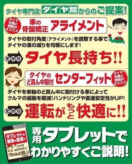 タイヤ館のオススメ作業!! ポスト 2018年10月20日 車の骨盤矯正「アライメント」 タイヤ(ホイール)のど真ん中取付け「センターフィット」 など、タイヤ交換と一緒にオススメしている作業が タイヤ館には色々とあります。 詳しくは、スタッフにご相談下さい。 タイヤ交換なら、タイヤ館 所沢へ!! ご来店をお待ちしております。