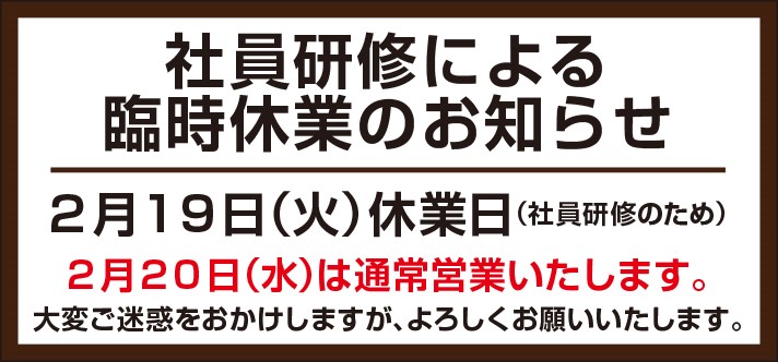 明日は臨時休業となります! ポスト 2019年2月18日 タイヤ館所沢HPをご覧の皆様 こんにちは・こんばんは! 明日、2月19日(火)は社員研修の為、誠に勝手ながら臨時休業となります。 明後日、2月20日(水)は通常営業しております。 大変ご迷惑をおかけしますが、よろしくお願いいたします。 皆様のご来店心よりお待ちしております。