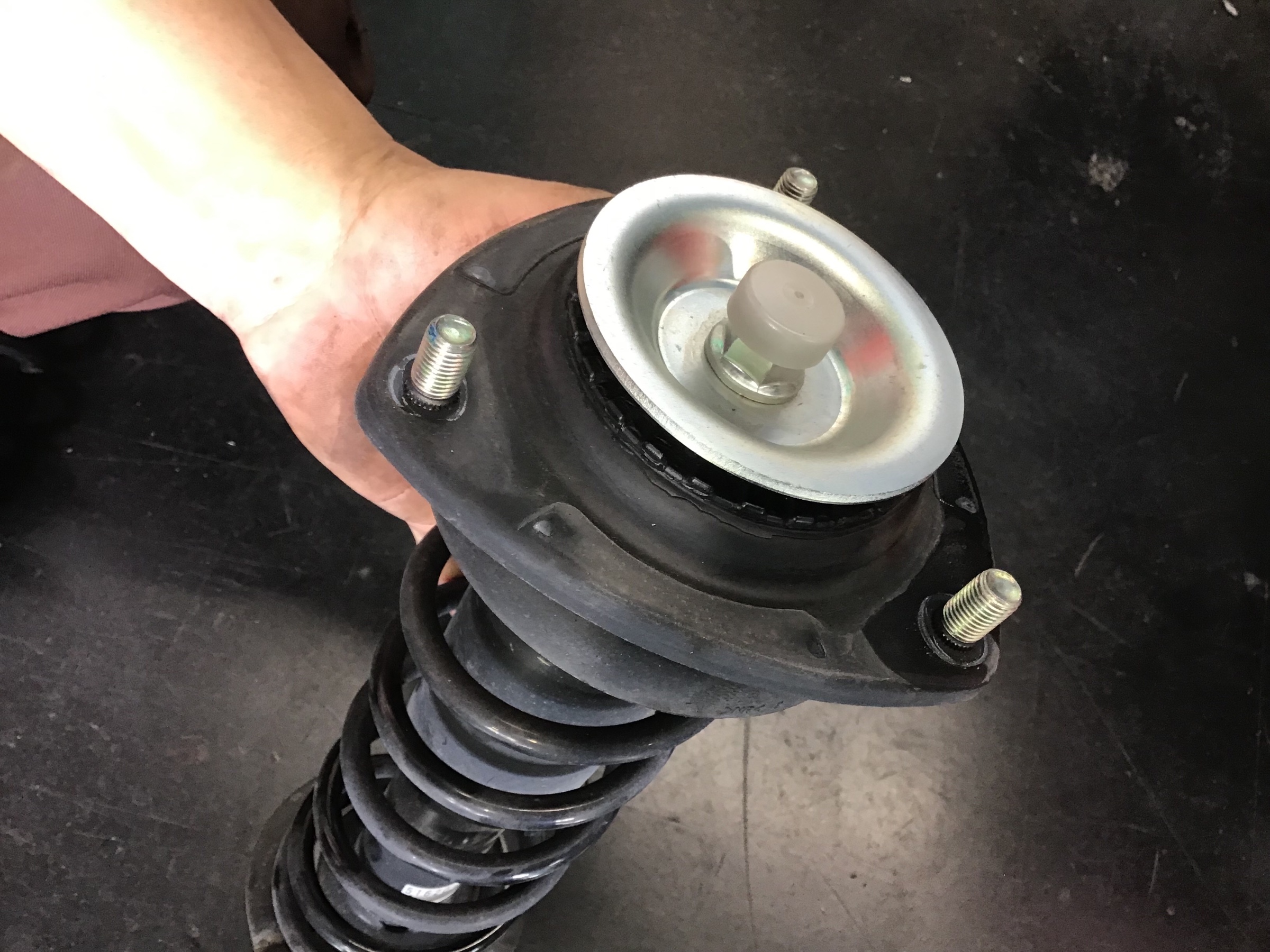 取り外したフロント側の純正ショック。今回交換する車高調は『テイン・ストリートベイシスZ』というモデルで、アッパーマウントは純正を移植して使います。