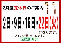 タイヤ館所沢のホームページをご覧の皆様 こんにちは・こんばんは! いつもご覧いただきありがとうございます!! 明日2月22日(火)は定休日となります。 水曜日ではないのでご注意ください!! また、2月23日(水)は営業になります。 よろしくお願いいたします。 今月の定休日一覧はこちら 2022年2月...