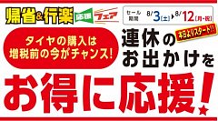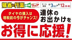 タイヤ館所沢のホームページをご覧の皆様こんにちは・こんばんは! 本日8月3日(土)から8月12日(月)まで『帰省・行楽応援フェア』を開催中です!! お盆休み直前!ご家族での実家への帰省やご友人との旅行などお出掛け予定の方も多いのでは?当店ではお出掛け前にタイヤの空気圧点検と一緒に無料...