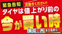 タイヤ館所沢のホームページをご覧の皆様こんにちは・こんばんは! 7月13日(土)から開催しております集中得市も 本日が最終日となりました。 既にご案内させて頂いておリますが、8月1日より ブリヂストン・セイバーリングブランドのタイヤを値上げさせて頂くこととなりました。 値上げ前の最後...