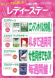 火曜日・木曜日はレディースデーでエンジンオイルがお得!!