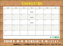 4月の定休日のご案内 定休日は、4日(水曜日) 11日(水曜日)、18日(水曜日)になります。 来週の25日(水曜日)は通常営業致しますので、ご来店お待ちしております。
