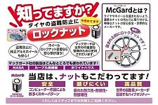 タイヤ・ホイールの盗難が増えています。 大事なホイールに、鍵をかけていますか? ナットの1個を、ロックナットに換えると、防犯性が高くなりますよ。 スタッドレスのアルミセットにオススメです。 ホイールによっては付かない場合がありますので、 詳しくは、スタッフにご相談下さい。