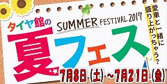 暑い夏がやってきました!!海へ山へお出かけの季節ですね!! 7月8日(土)~7月21日(金)の期間でタイヤ館【夏フェス】を開催中です。 楽しいお出かけは準備が第一! エンジンオイル、バッテリー、エアコンフィルター、ワイパーなど、 夏のドライブにオススメなアイテムばかりです☆ 是非、...