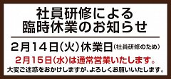 明日、2月14日(火曜日)、社員研修の為、 誠に勝手ながら、臨時休業とさせて頂きます。 翌日、2月15日(水曜日)は、 通常営業いたします。 大変ご迷惑をおかけしますが、よろしくお願いいたします。 タイヤ交換なら、タイヤ館所沢へ!ご来店お待ちしております。