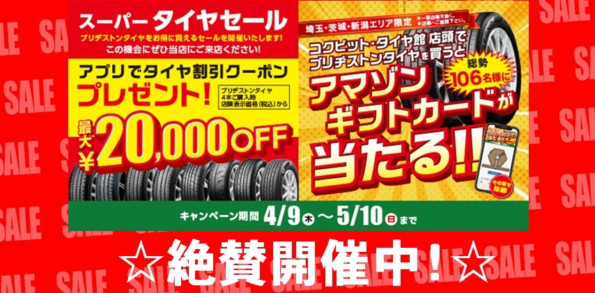 セール期間中ブリヂストンタイヤ4本ご購入で最大20,000円OFF!