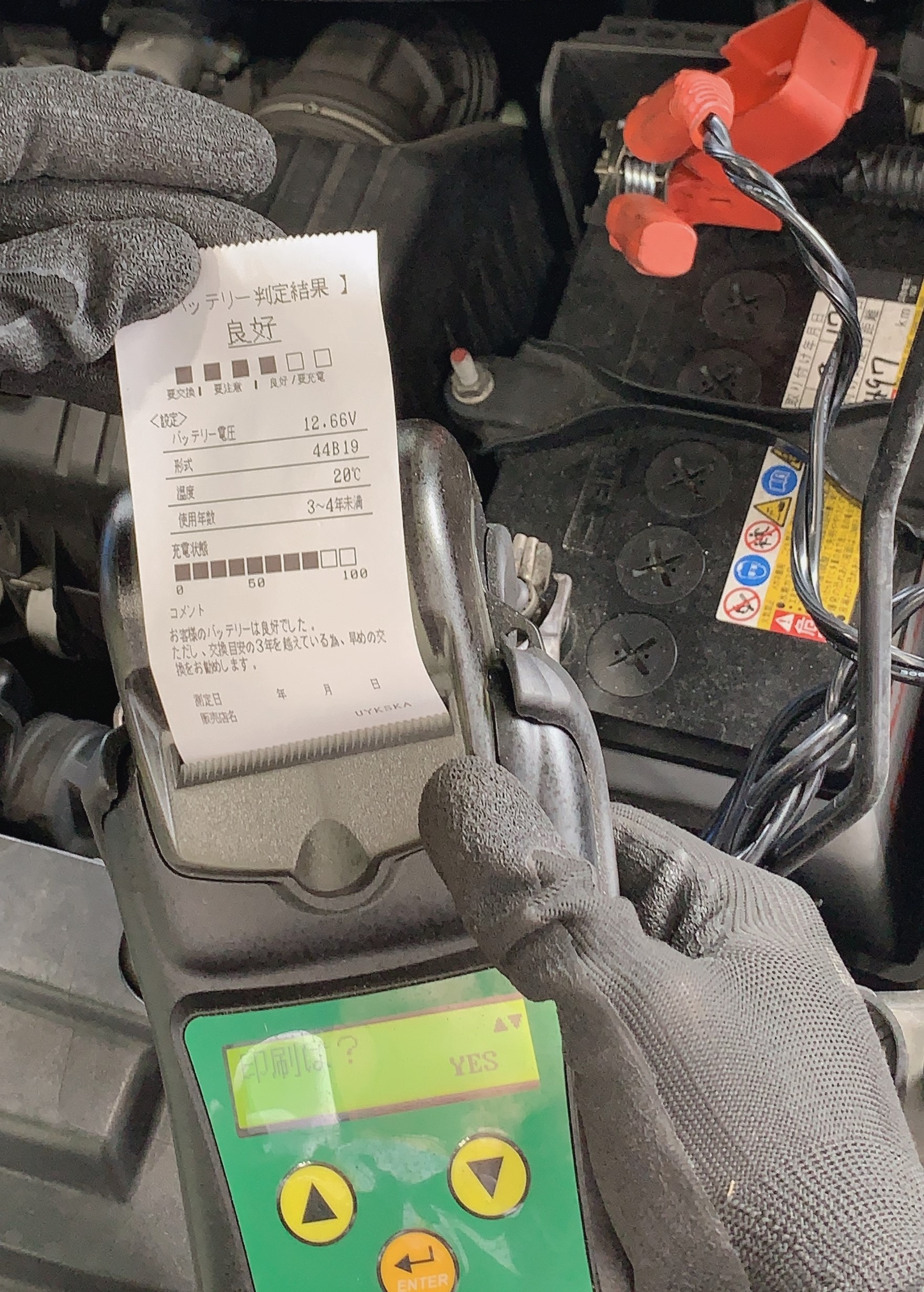 タイヤ館では、このようにバッテリーテスターを使い、