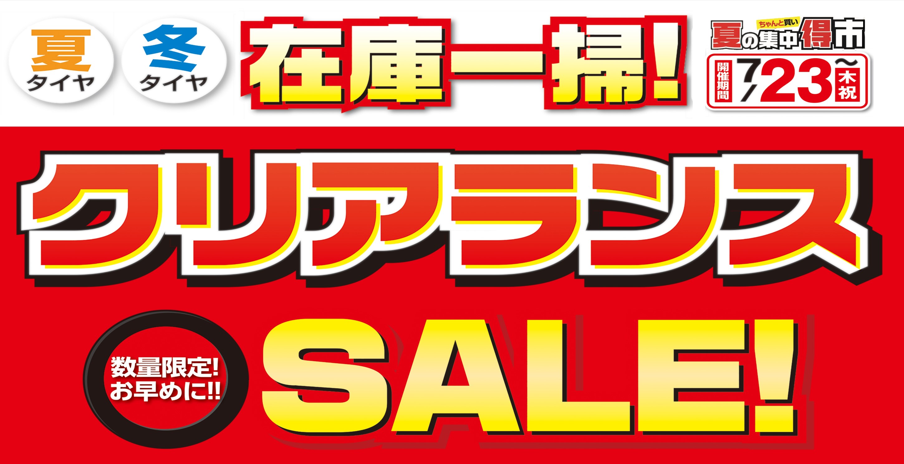 夏の集中得市★クリアランスSALE★開催のお知らせ ポスト 2020年7月20日 夏の集中得市★クリアランスSALE★開催のお知らせ 期間:7/23(木)~ 夏・冬タイヤ全てが対象商品!! スタッドレス&アルミホイールセットもお持ち帰りで対応しております!! アルミホイールもクリアランス価格で大放出です!! この機会にどしどしご来店下さいませ。 TELにてお問い合わせも受付中です。 担当:ただ