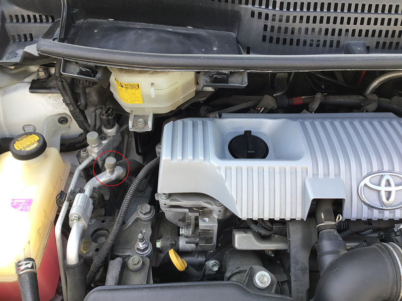 ボンネットを開け、運転席側を見ると、赤く〇をつけた配管が見えます。