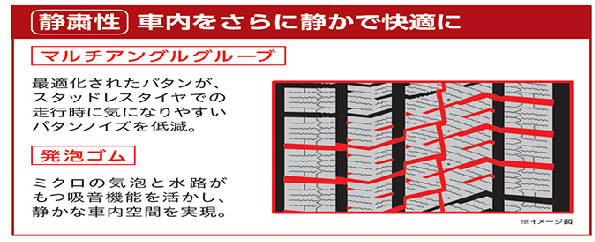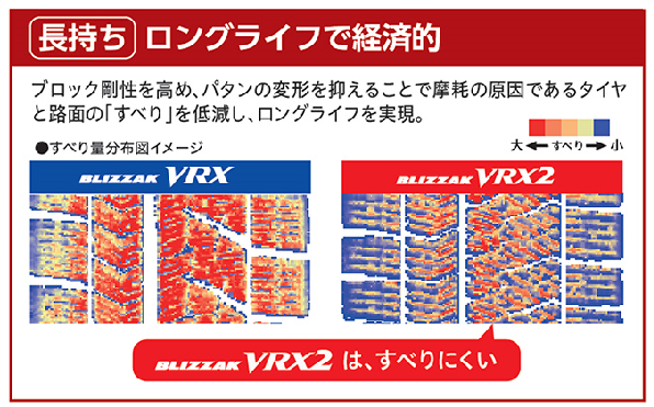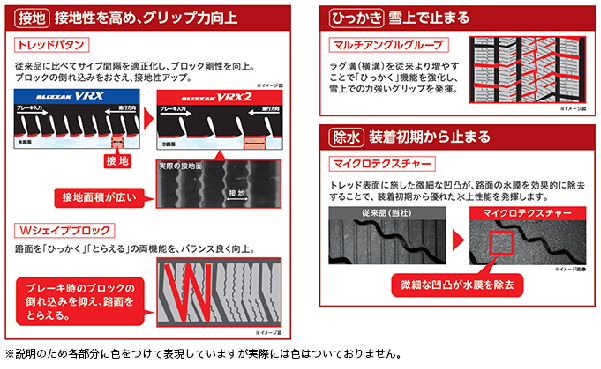 これによって従来のVRX対比「氷上ブレーキ10%短縮」、「摩耗ライフ22%向上」、「静粛性向上(騒音エネルギー31%低減)」と大幅に性能を向上。