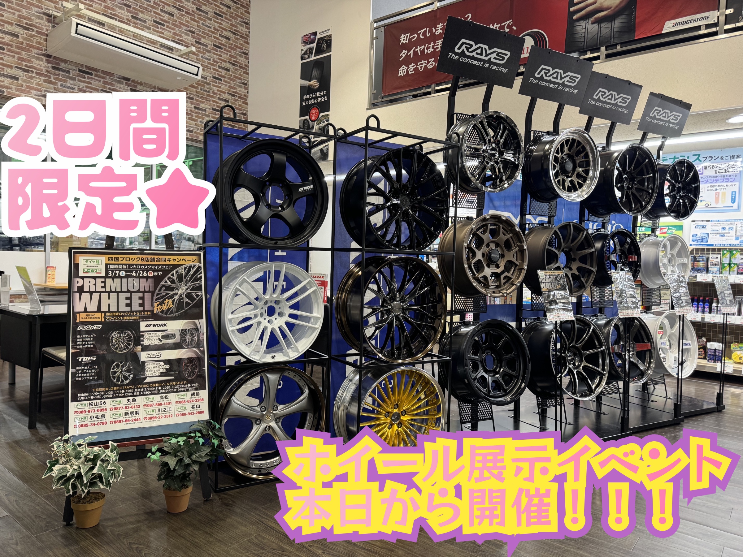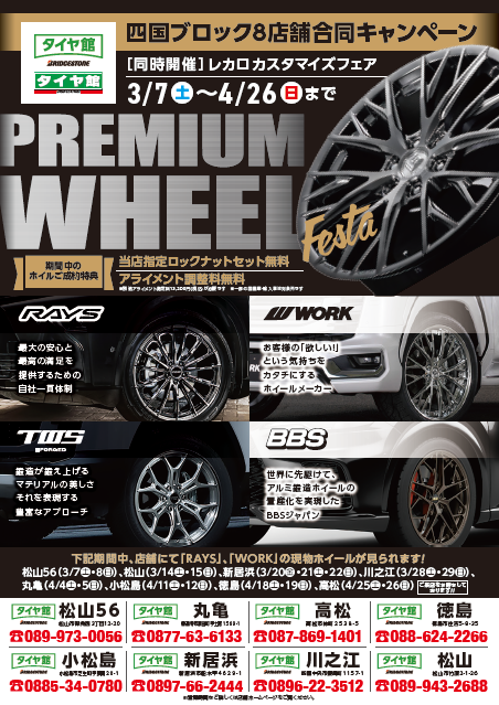 本日より開催♪♪ プレミアムホイールフェスタ☆新作や限定ホイールが見えます★ ポスト 2026年4月18日 愛車のカスタムは当店へお任せ!! たくさんのホイール達が当店に勢揃いしました(*^▽^*) お見積り、見に来ただけ、仮あてだけでも 可能なのでお気軽にご来店くださいませ★ 当店のスタッフが愛車にぴったりのデザインやサイズを ご提案させて頂きます(^^)/ 皆さまのご来店をお待ちしております!!! タイヤ館 徳島 住所:770-0861徳島県徳島市住吉5-8-35 電話番号: 088-624-2266 相談予約 タイヤ点検・安全点検/タイヤ履き替え/オイル交換/その他ピット作業の予約