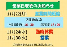 ●明日11/22(月) 営業時間短縮です●