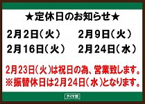 2月24日(水)は定休日です。 ご来店の際はご確認下さい。