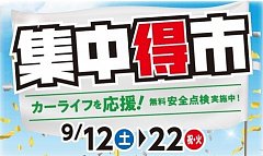 9月12日(土)から開催していました【集中得市】は 昨日9月22日(火)をもちまして終了致しました♪ 期間中たくさんのご来店、ありがとうございました★☆ 引き続き【車高調キャンペーン】は開催中です♪ 【SUV・レグノキャンペーン】も併せて開催中です! 対象商品をお買い上げの方には お気持ちながらプレ...