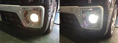 ダイハツ ウェイクのフォグランプ交換をしました(所要時間10分程度) PIAA LEDバルブ 6000Kで明るさはなんと3700lm(ルーメン) 見た目で光量の違いが分かるほどです(左:ハロゲン 右:LED) タイヤ館では各メーカーのLEDバルブを取り扱いしております。 お気軽にご相談下さい!!