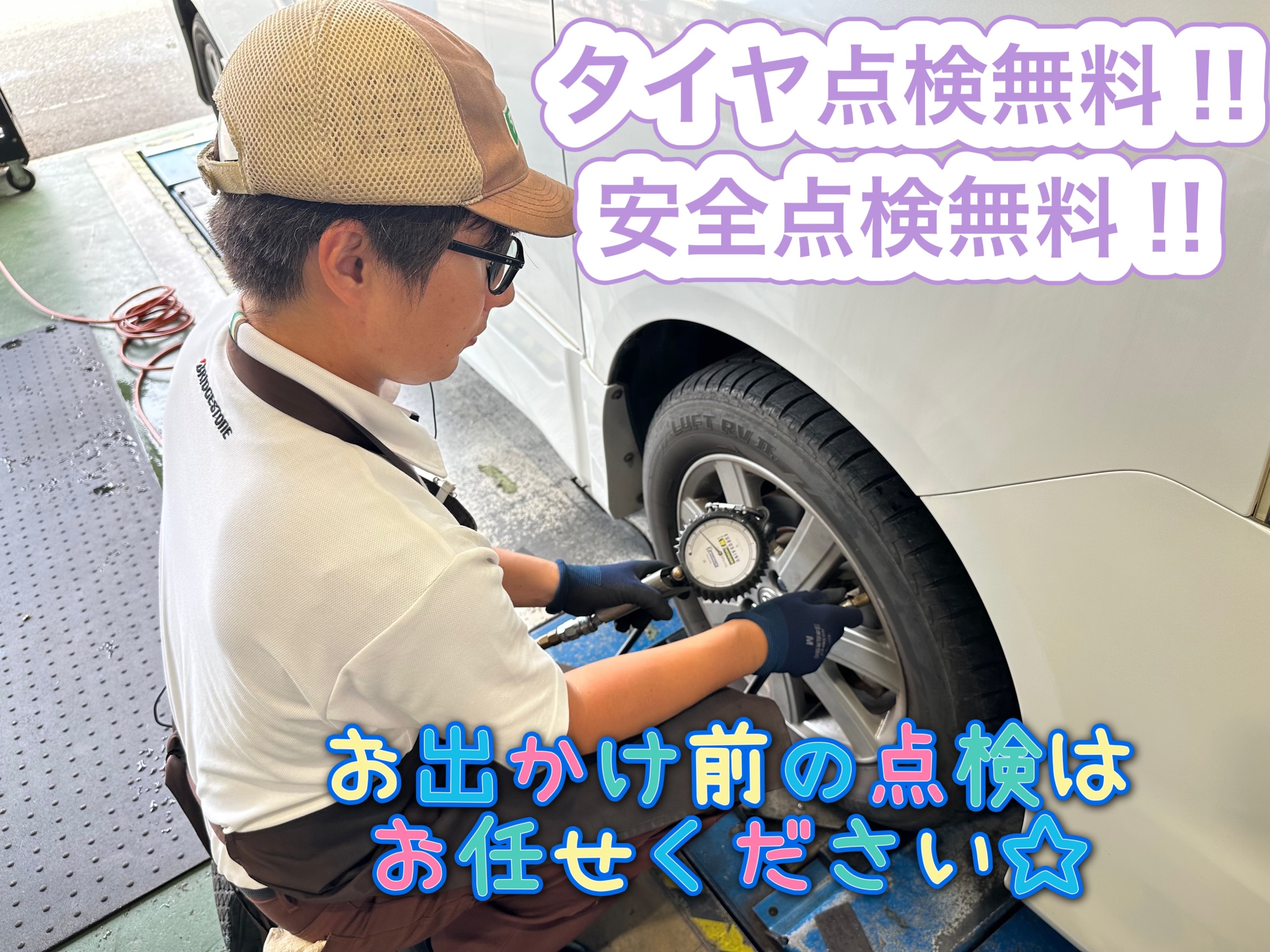 タイヤ点検無料!!安全点検無料★ 明日からお盆休み突入です!! お出かけ先でもし、トラブルがあったら嫌ですよね、、、。 なので、タイヤ館ではお出かけ前には お車の点検を無料で実施しています( ◠‿◠ ) お出かけ時のトラブルを防ぐ為にも バッテリー点検、ワイパーの点検、タイヤの点検など お車...