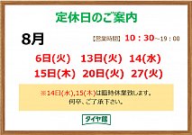 明日8/13~8/15までは夏季休暇となります。 8/16金曜日からは通常営業です。 お手数をおかけしますがよろしくお願いいたします。 タイヤ館徳島一同