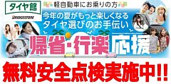 『帰省・行楽』などお車を頻繁に利用する時期です。 お出掛け中、トラブルにあわないためにも事前の点検をおすすめします。 タイヤ館では只今『無料安全点検実施中』 お気軽にご来店下さい。