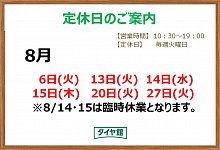 8月の定休日のお知らせ ※8/14・15は臨時休業となります。