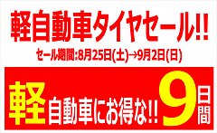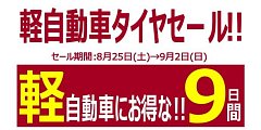 軽自動車タイヤがお得な9日間 軽自動車タイヤセール★開催中 期間:8/25(土)~9/2(日) 猛暑でヘトヘトの愛車のメンテナンスも同時にお任せあれ!! お気軽にお越しくださいませ。