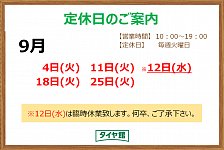 いつもタイヤ館徳島HPをご覧頂き、まことにありがとうございます。 9月の定休日のご案内です。 12日(水)が臨時休業日となっていますので、お間違いのないようご注意ください。 13日(木)からは通常営業となっています。 みなさまのご来店、お待ちしております。