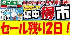 タイヤ館徳島店のホームページをご覧頂き誠に有難う御座います! タイヤ値上げ前の還元セール【集中得市】も本日最終日です! 連日沢山のお客様にご来店頂き誠に感謝しています。 タイヤ館徳島店は本日の閉店時間19時まで、精一杯還元いたします! 同じタイヤ買うなら少しでもお安く!お得に! 本...