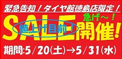 ☆マチ・アソビ☆賑わってますね~~! 徳島県内の色んな場所で色んなイベントが沢山開催されてますが タイヤ館徳島店も負けずに集中得市ビックセール開催してます!!! セールも残す所2日間となってますが元気一杯営業中です! 6月にはタイヤの値上げも待ってます!最近はタイヤの欠品状態もチラ...