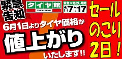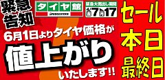 始まります集中得市!今月2回目のセールですが・・・なぜ?と疑問に思った方! タイヤの交換は今がチャンスなんです!もうすぐ6月よりタイヤが値上がりしてしまいます! だから値上げ前の今がチャンス!タイヤ館徳島店では皆様に少しでもお安く提供できるこの時期に セール開催なんです! 徳島市内・...