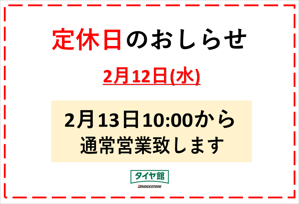 いつもタイヤ館徳島店をご利用いただき 有難うございます。 2月の定休日は下記の通りとさせていただきます。 2月11日は営業します!!!! ※2月12日(水)お休みとなります。 定休日でも ご自宅からタイヤをご購入頂けます! 詳しくは↓↓↓をチェック(^^)v 自宅でもタイヤのご購入ができます♪