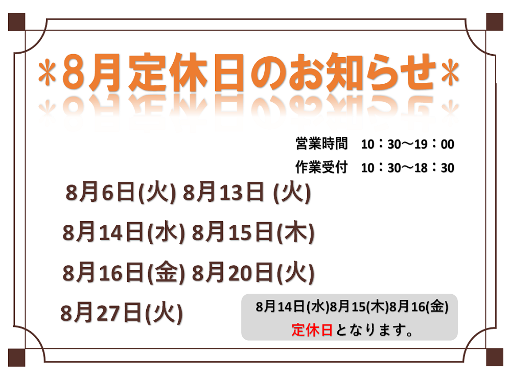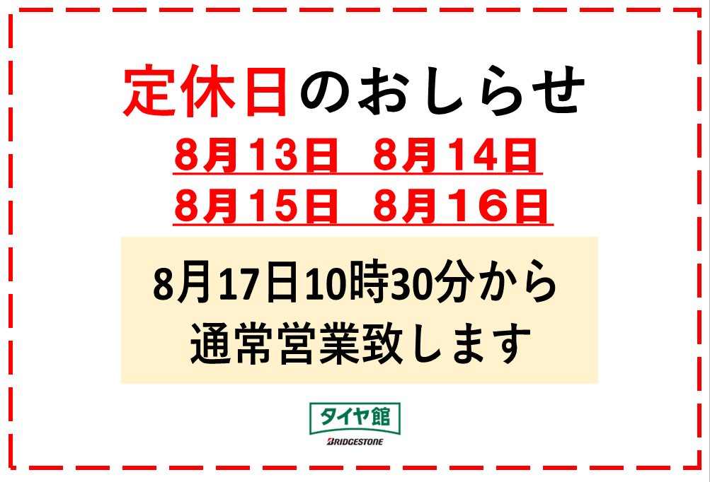 いつもタイヤ館徳島店をご利用いただき 本当に有難うございます。 誠に勝手ながら 8月の定休日は毎週火曜日とさせていただきます。 ※8月14日(水)8月15日(木)8月16日(金)は定休日となります。 定休日でも ご自宅からタイヤをご購入頂けます! 詳しくは↓↓↓をチェック(^^)v ご自宅からでもタイヤ購入が...