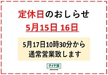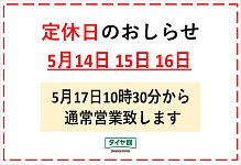15日・16日は定休日となっております。 ご迷惑をおかけしますが、宜しくお願い致します。 17日(金)10時30分から通常営業しておりますので、 皆様のご来店をお待ちしております(^^)v 自宅からでもタイヤの購入できます♪詳しくコチラ