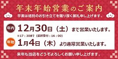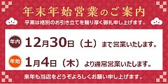 年末年始の休業日は 12月31日~1月3日となっております。 お間違えの無いようお願い致します。