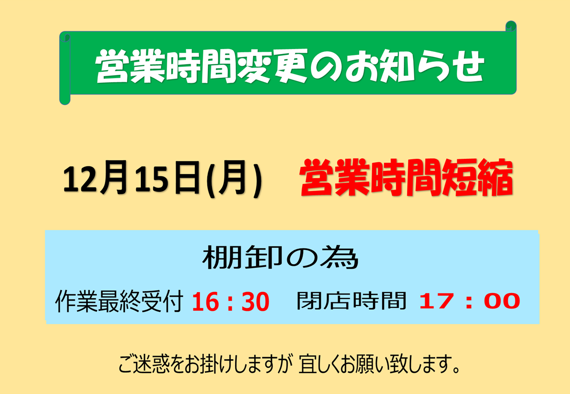 12/15(月)は棚卸しのため15:00閉店です‼‼ お客様にはご迷惑をおかけ致しますが お間違いのないようよろしくお願いいたします。