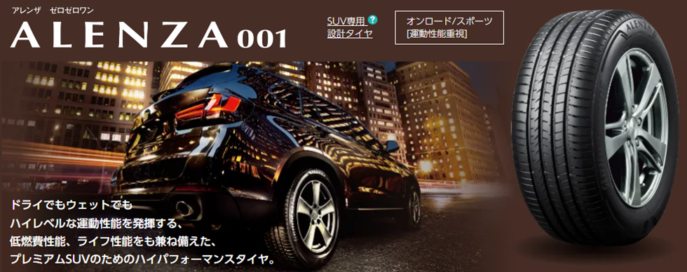 ブリヂストンが誇るプレミアムSUVタイヤ 『ALENZA001』 ドライでもウェットでもハイレベルな運動性能を発揮する 低燃費性能、ライフ性能をも兼ね備えた、 プレミアムSUVのためのハイパフォーマンスタイヤです。