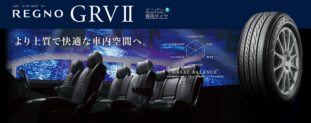 ブリヂストンのミニバン専用設計 『REGNO GRVⅡ』 より上質で快適な車内空間を実現できる サイレントテクノロジーを搭載! またミニバン特有のふらつきを低減し、 高次元の低燃費性能とウェット性能を両立したタイヤです。