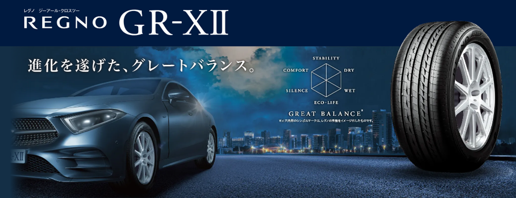 上質な静粛性能、優雅な乗り心地、冴えわたる運動性能。 ブリヂストンが誇るグレートバランス 『REGNO GR-XⅡ』 セダン・コンパクト推奨設計のレグノ! ロードノイズ・パタンノイズ共に低減し、 様々な路面で高い静粛性能を発揮します。