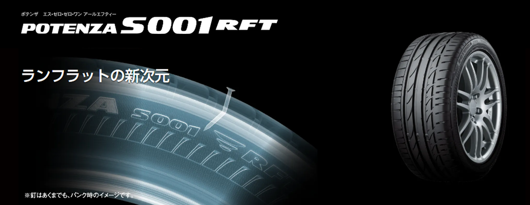 セダン・スポーツが推奨車種の 『POTENZA S007 RFT』 パンクしても走行できる、ブリヂストンのランフラットテクノロジーを採用! ランフラットタイヤは主に、輸入車などに搭載されている事が多いタイヤです。 S007 RFTはノーマルタイヤと遜色ない乗り心地を実現しました。