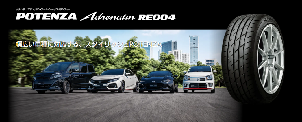 軽自動車からミニバンまで 幅広いサイズラインナップからお選び頂ける 『POTENZA Adrenalin RE004』 POTENZAならではの操縦安定性とレスポンスで 楽しいドライブをサポートします☆ クルマ・運転が好きな方はぜひお試しください(^^)/