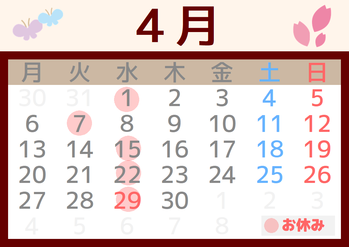1日(水)・7日(火)・15日(水)・22日(水)・29日(水)
