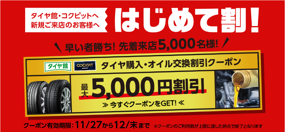 タイヤ館を初めてご利用いただくお客様限定のクーポンをご用意しております!!!